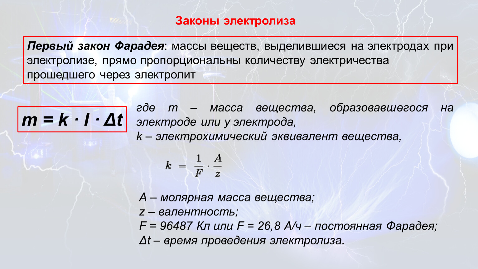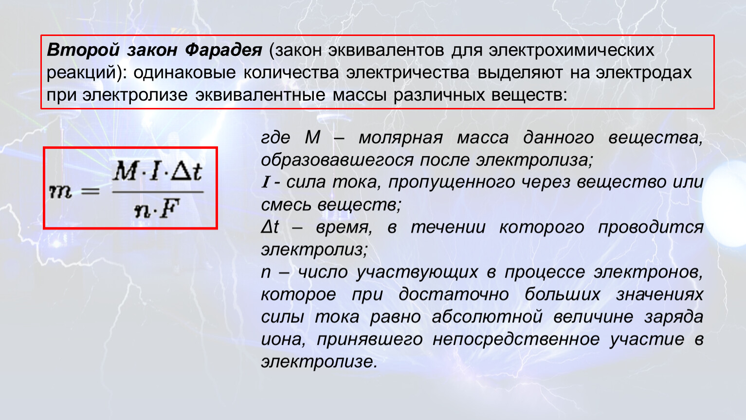 Второй закон Фарадея (закон эквивалентов для электрохимических реакций): одинаковые количества электричества выделяют на электродах при электролизе эквивалентные массы различных веществ: