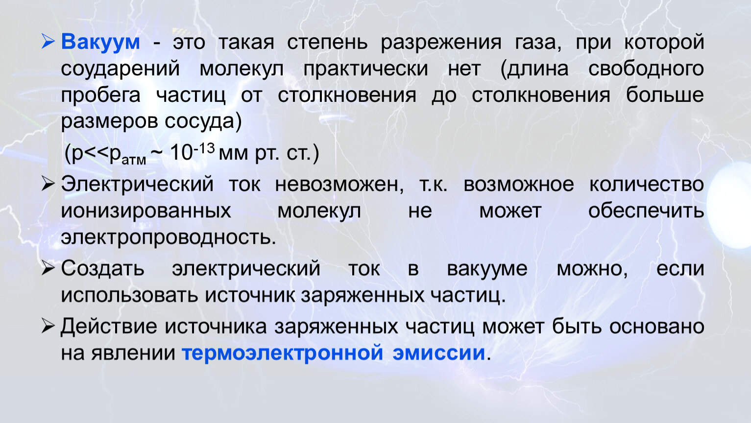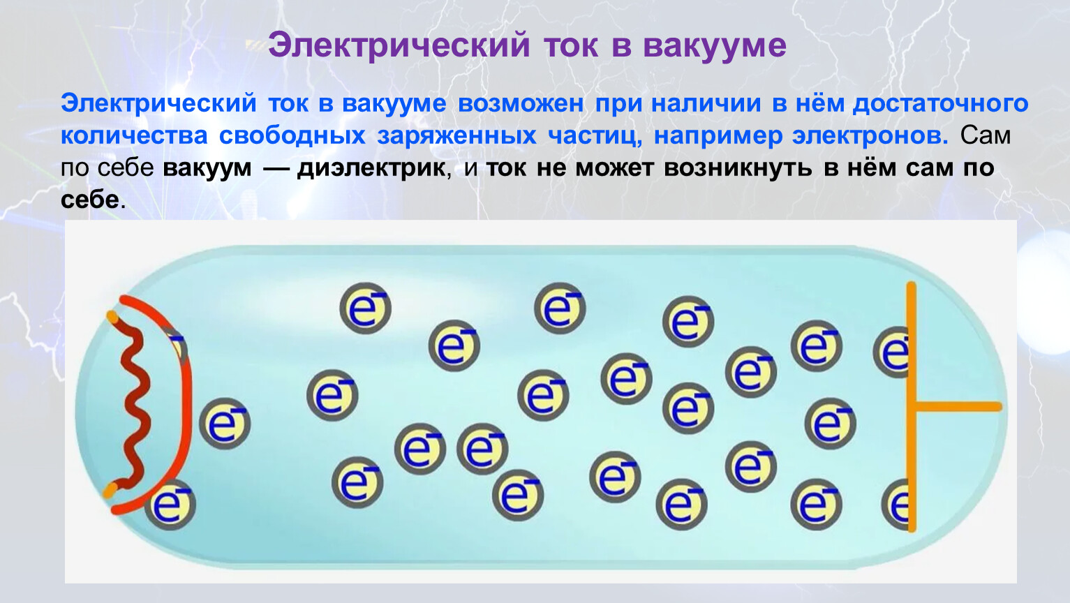 Электрический ток в вакууме возможен при наличии в нём достаточного количества свободных заряженных частиц, например электронов. Сам по себе вакуум — диэлектрик, и ток не может возникнуть в нём сам по себе.