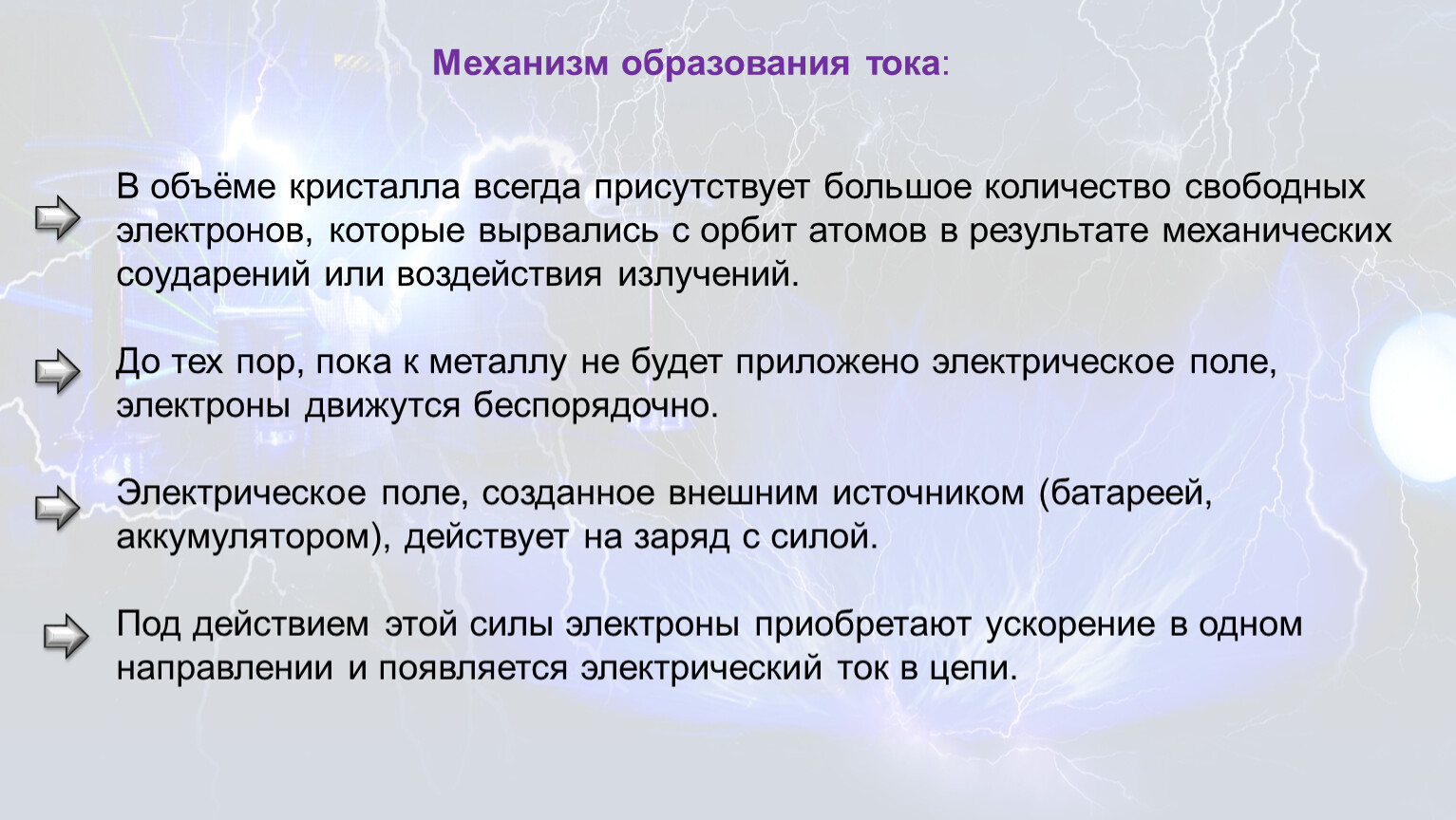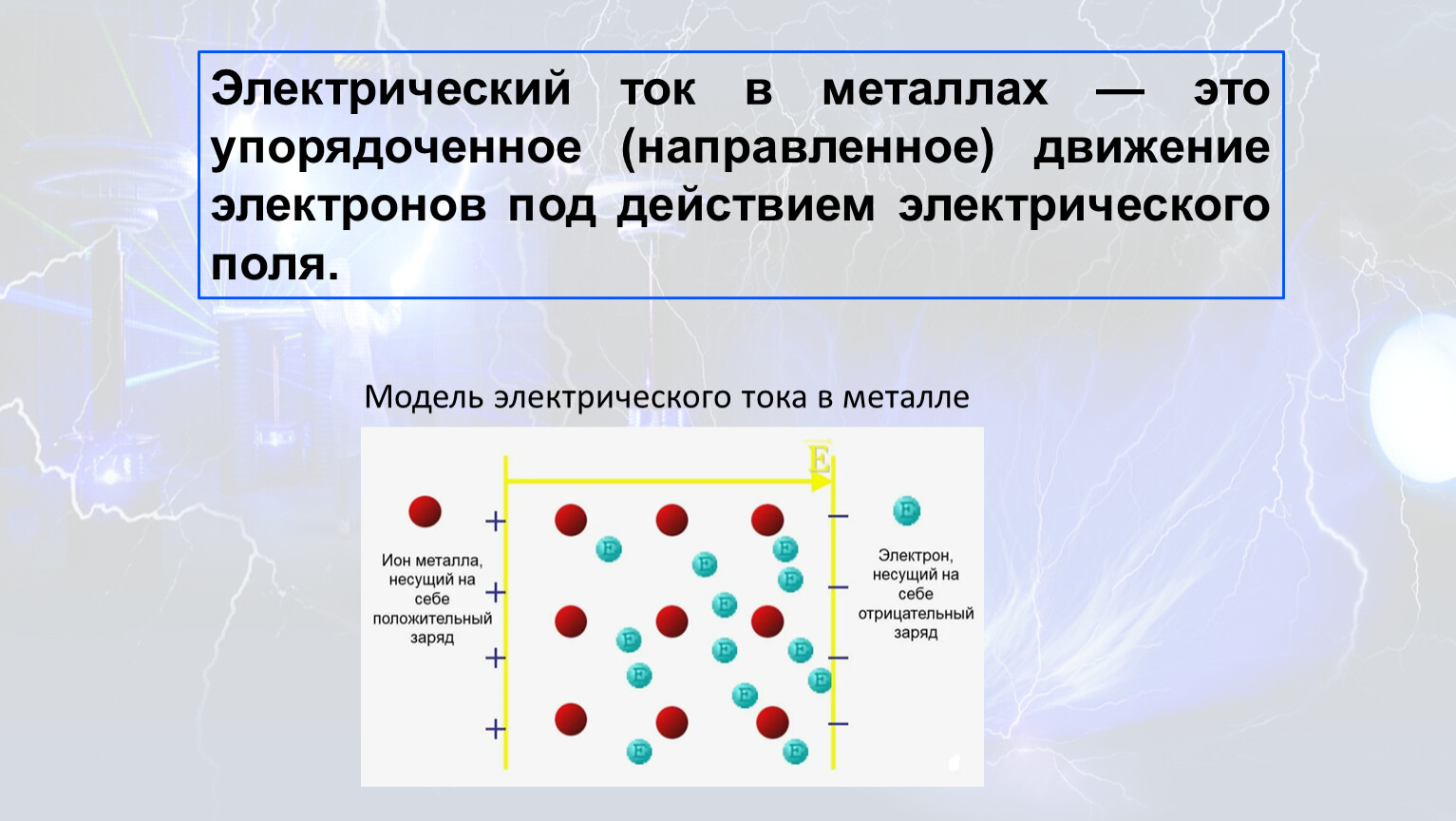 Электрический ток в металлах — это упорядоченное (направленное) движение электронов под действием электрического поля.