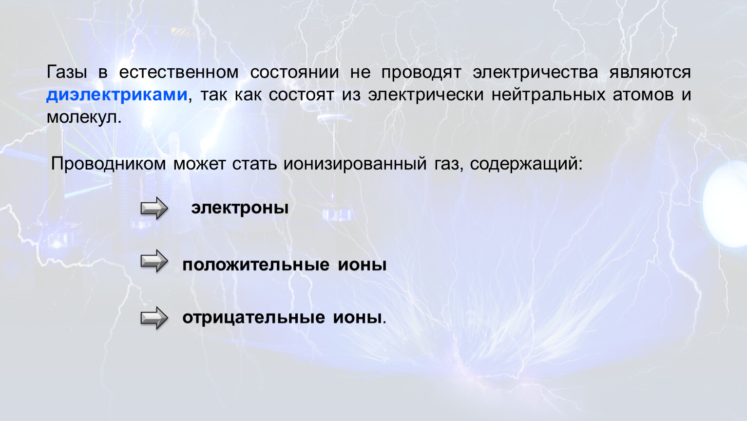 Газы в естественном состоянии не проводят электричества являются диэлектриками, так как состоят из электрически нейтральных атомов и молекул.