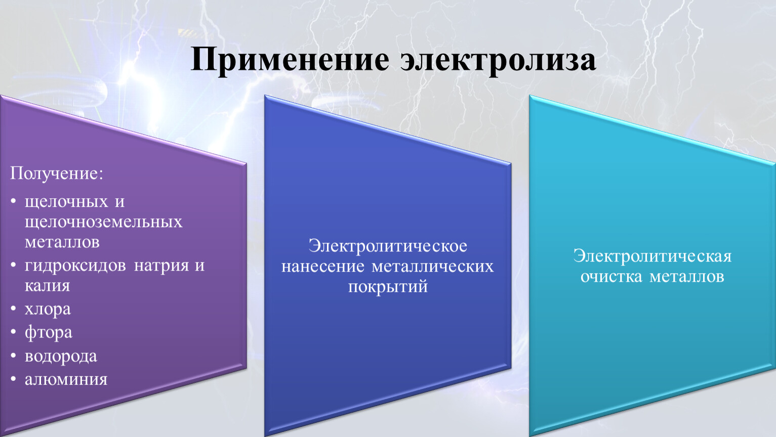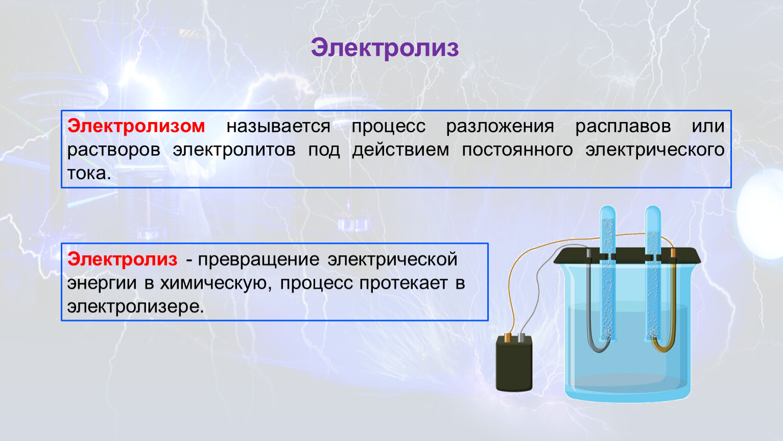 Электролиз - превращение электрической энергии в химическую, процесс протекает в электролизере.