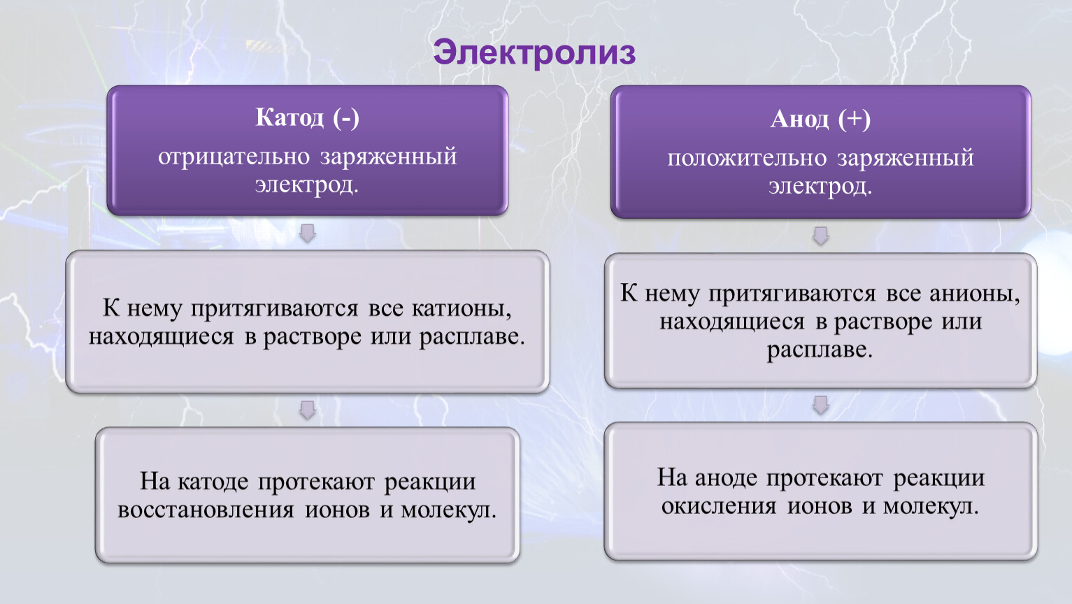 Электролизом называется процесс разложения расплавов или растворов электролитов под действием постоянного электрического тока.