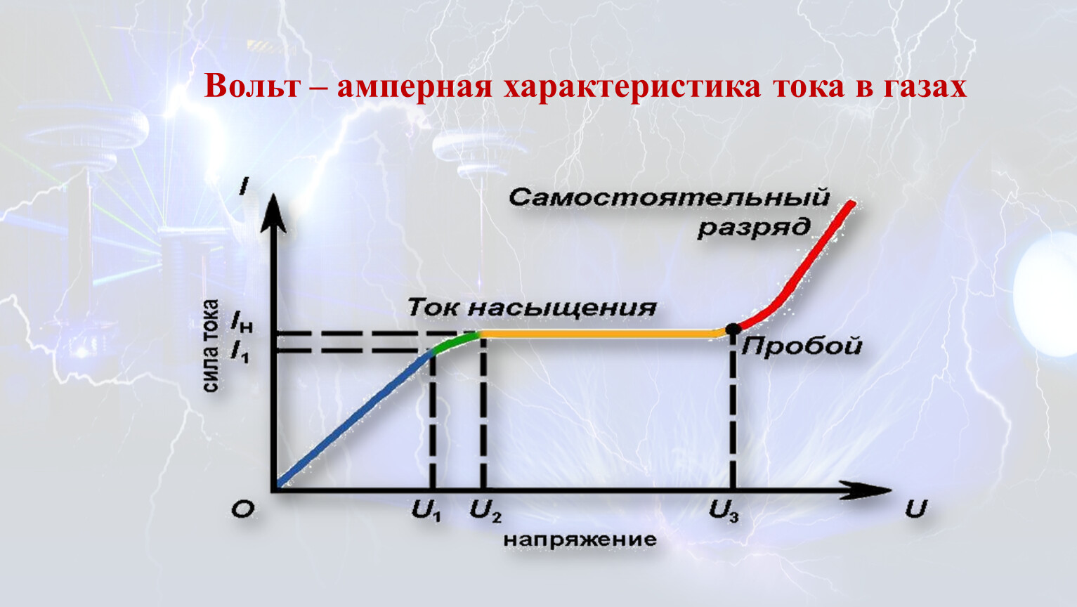 При больших напряжениях ток достигает насыщения, т.е. максимального значения.