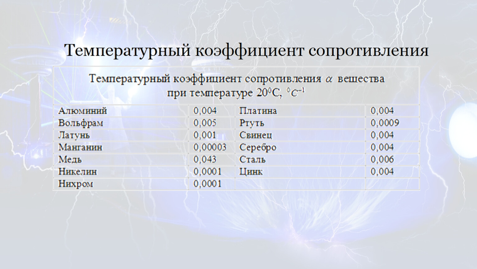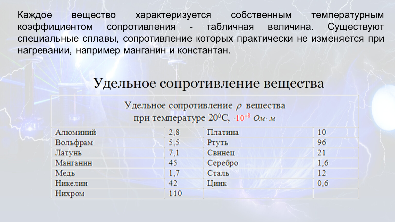 Каждое вещество характеризуется собственным температурным коэффициентом сопротивления - табличная величина. Существуют специальные сплавы, сопротивление которых практически не изменяется при нагревании, например манганин и константан.