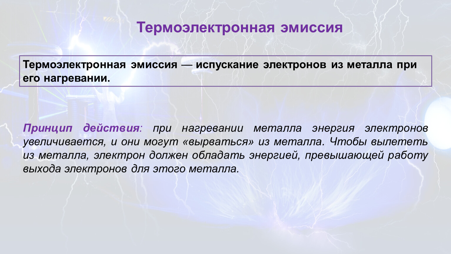 Принцип действия: при нагревании металла энергия электронов увеличивается, и они могут «вырваться» из металла. Чтобы вылететь из металла, электрон должен обладать энергией, превышающей работу выхода электронов для этого металла.
