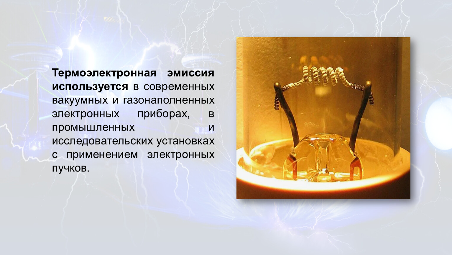 Термоэлектронная эмиссия используется в современных вакуумных и газонаполненных электронных приборах, в промышленных и исследовательских установках с применением электронных пучков.