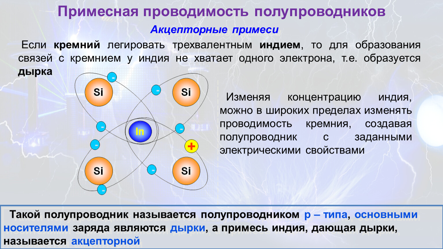 Если кремний легировать трехвалентным индием, то для образования связей с кремнием у индия не хватает одного электрона, т.е. образуется дырка