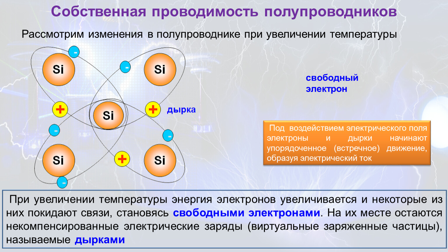 При увеличении температуры энергия электронов увеличивается и некоторые из них покидают связи, становясь свободными электронами. На их месте остаются некомпенсированные электрические заряды (виртуальные заряженные частицы), называемые дырками