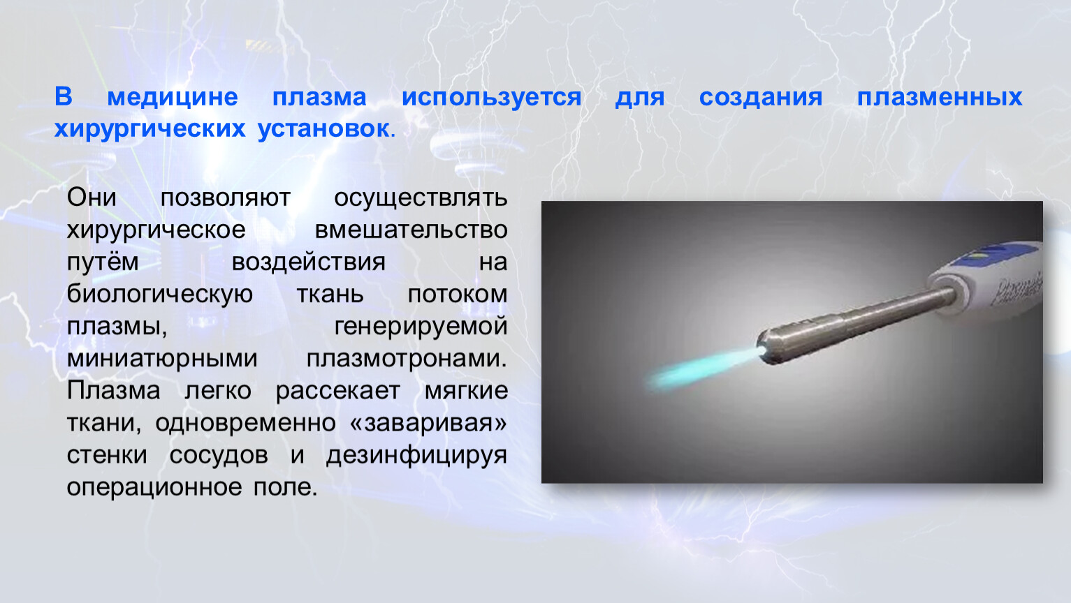 Они позволяют осуществлять хирургическое вмешательство путём воздействия на биологическую ткань потоком плазмы, генерируемой миниатюрными плазмотронами. Плазма легко рассекает мягкие ткани, одновременно «заваривая» стенки сосудов и дезинфицируя операционное поле.