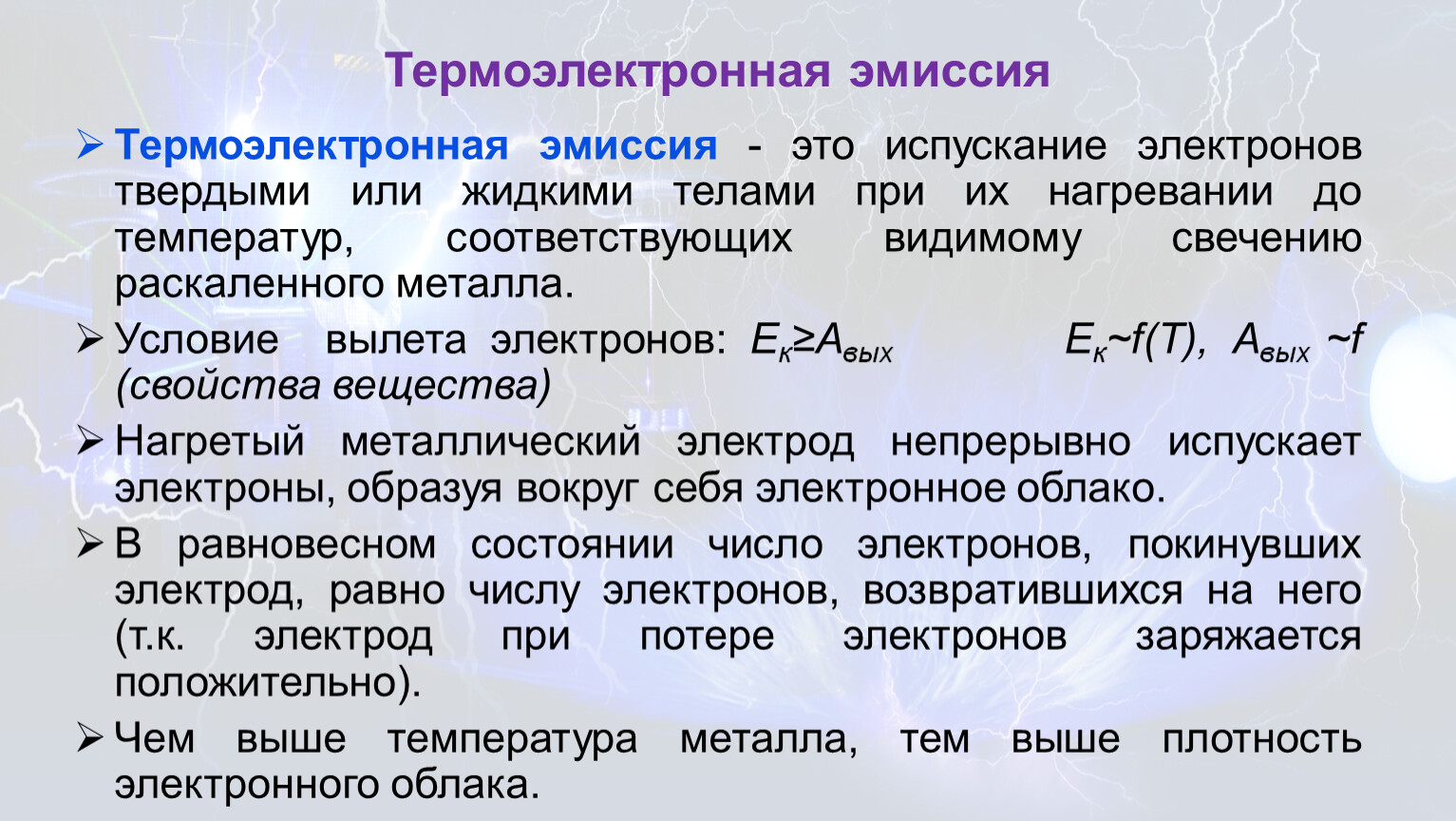 Термоэлектронная эмиссия - это испускание электронов твердыми или жидкими телами при их нагревании до температур, соответствующих видимому свечению раскаленного металла.