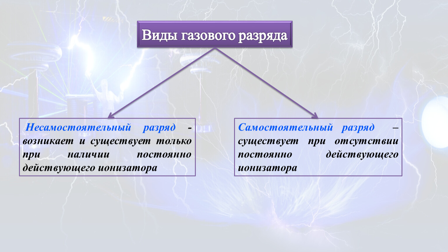 Несамостоятельный разряд - возникает и существует только при наличии постоянно действующего ионизатора