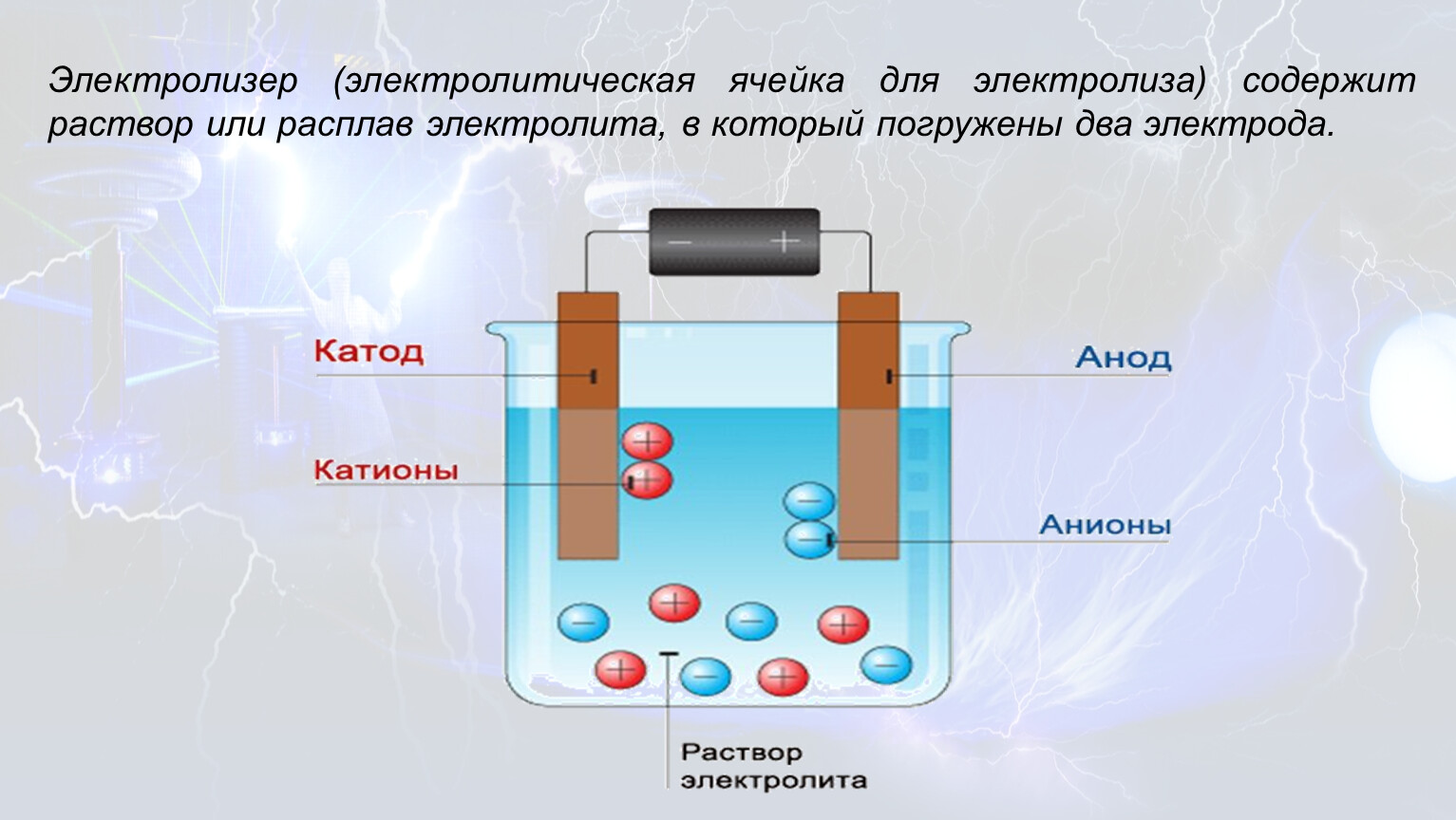 Электролизер (электролитическая ячейка для электролиза) содержит раствор или расплав электролита, в который погружены два электрода.