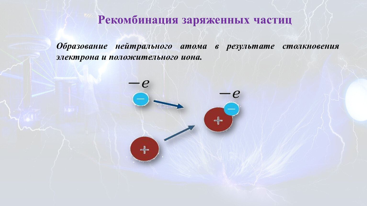 Образование нейтрального атома в результате столкновения электрона и положительного иона.