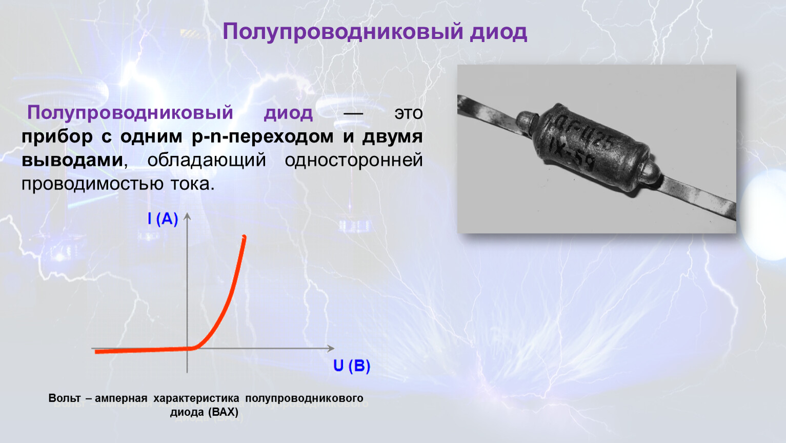 Полупроводниковый диод — это прибор с одним p-n-переходом и двумя выводами, обладающий односторонней проводимостью тока.