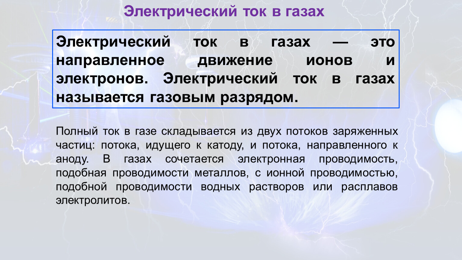 Электрический ток в газах — это направленное движение ионов и электронов. Электрический ток в газах называется газовым разрядом.