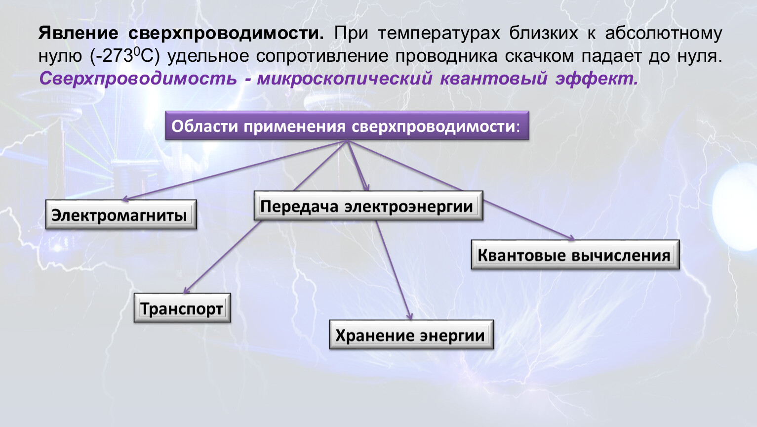 Явление сверхпроводимости. При температурах близких к абсолютному нулю (-2730C) удельное сопротивление проводника скачком падает до нуля. Сверхпроводимость - микроскопический квантовый эффект.