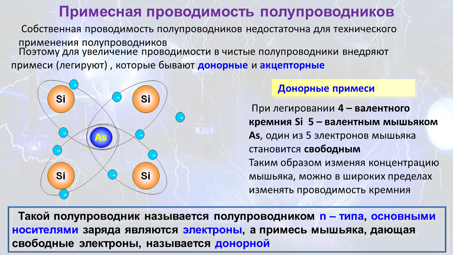 Поэтому для увеличение проводимости в чистые полупроводники внедряют примеси (легируют) , которые бывают донорные и акцепторные