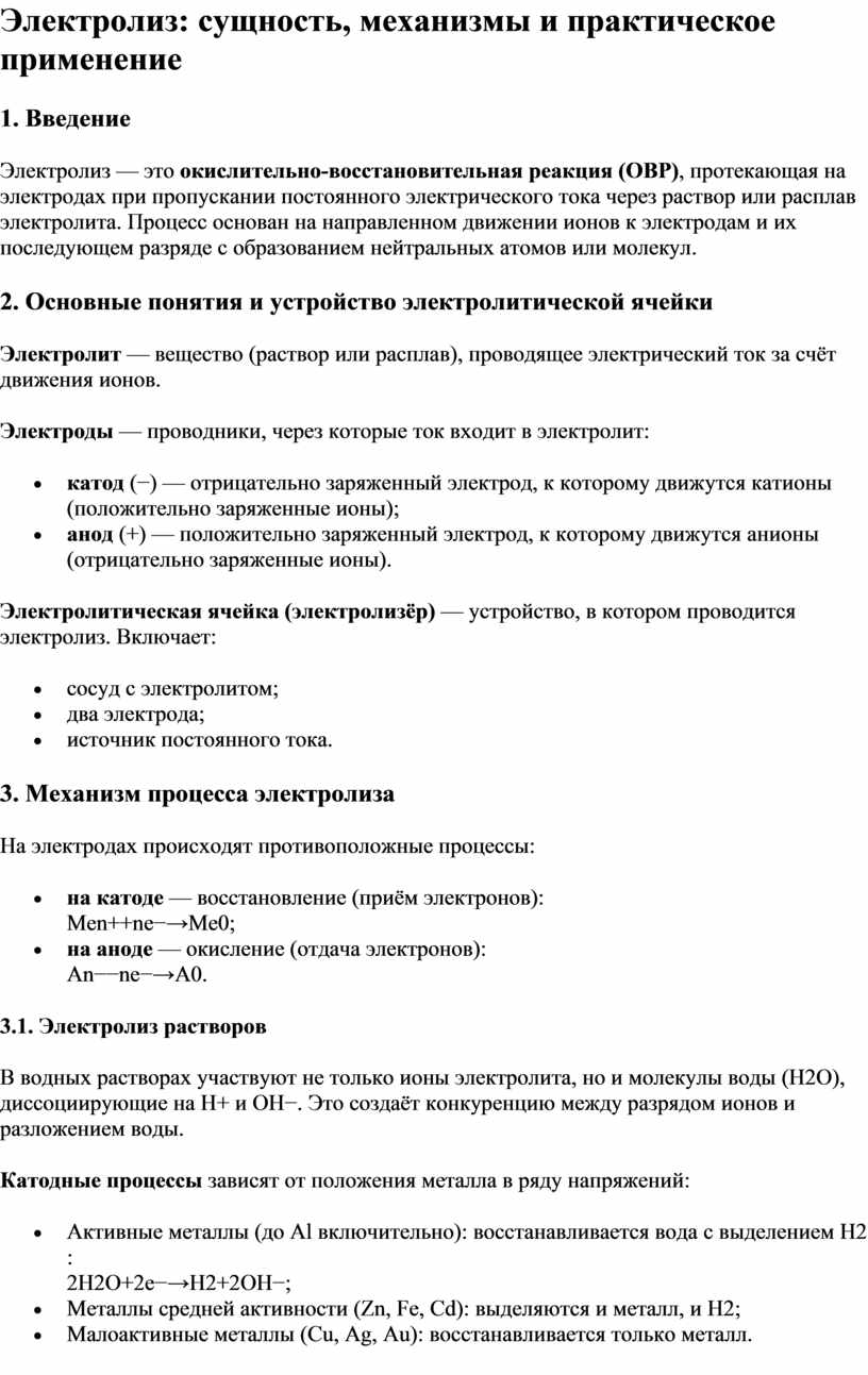 Электролиз — фундаментальный электрохимический процесс, имеющий огромное значение в науке и технике. Его принципы лежат в основе: