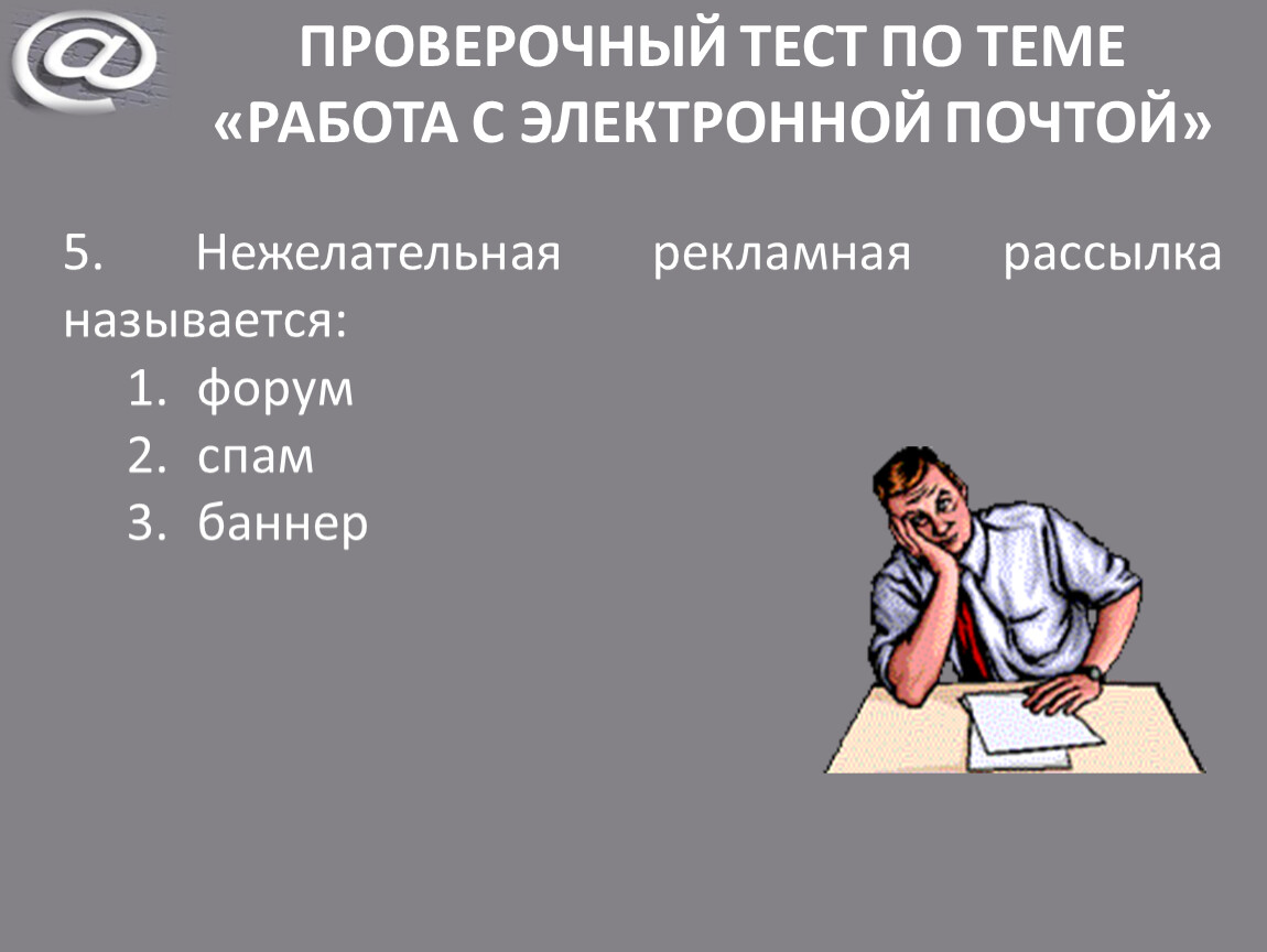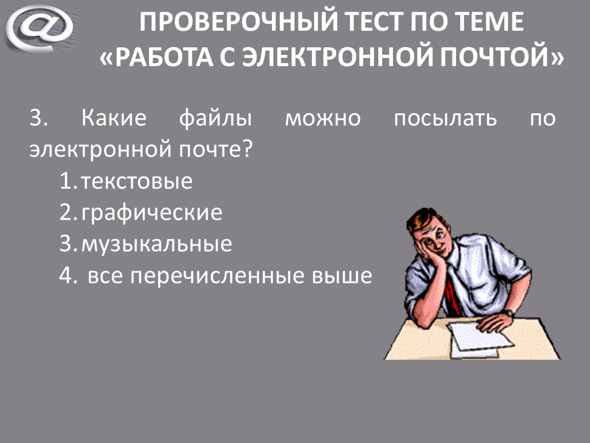 2. Написать электронное письмо, в теме указать фамилии учеников группы, поле для текста оставить пустым.3. Прикрепить к письму файл «Тест ЭТ».