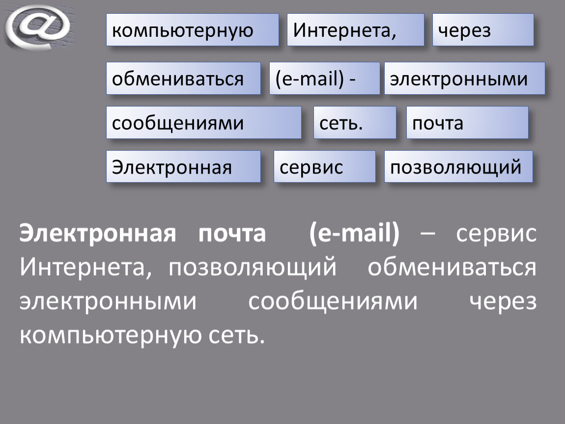 Электронная почта (e-mail) – сервис Интернета, позволяющий обмениваться электронными сообщениями через компьютерную сеть.