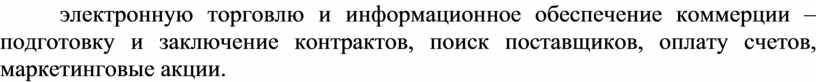 Можно выделить два аспекта электронной коммерции: непосредственно электронную торговлю и информационное обеспечение коммерции – подготовку и заключение контрактов, поиск поставщиков, оплату счетов, маркетинговые акции.