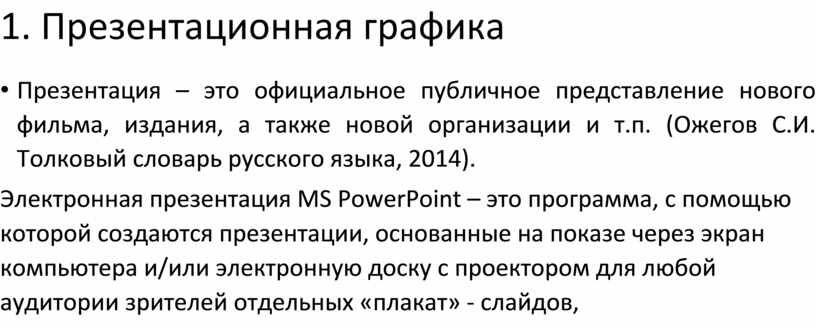 • Презентация – это официальное публичное представление нового фильма, издания, а также новой организации и т.п. (Ожегов С.И. Толковый словарь русского языка, 2014).