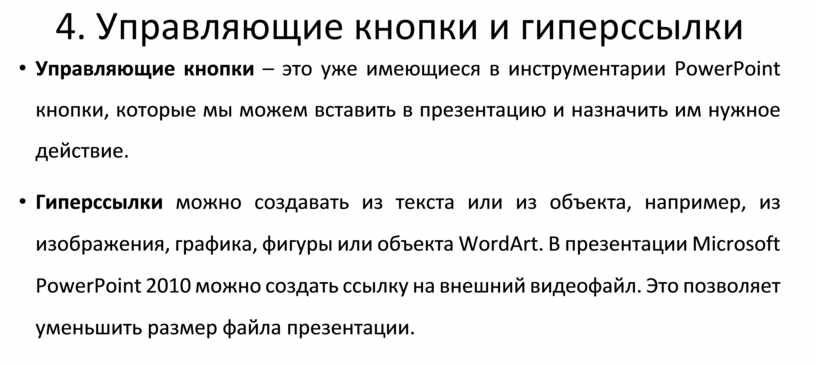 • Гиперссылки можно создавать из текста или из объекта, например, из изображения, графика, фигуры или объекта WordArt. В презентации Microsoft PowerPoint 2010 можно создать ссылку на внешний видеофайл. Это позволяет уменьшить размер файла презентации.