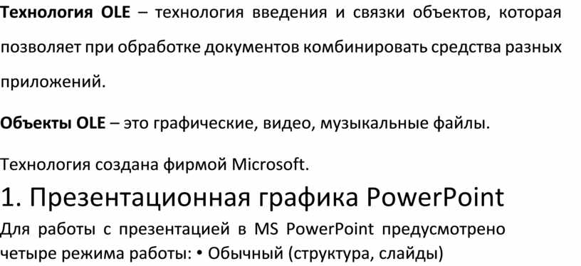 Технология OLE – технология введения и связки объектов, которая позволяет при обработке документов комбинировать средства разных приложений.
