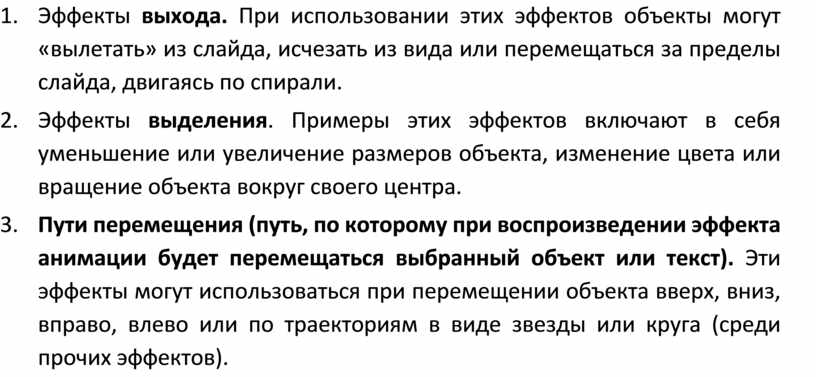 2. Эффекты выхода. При использовании этих эффектов объекты могут «вылетать» из слайда, исчезать из вида или перемещаться за пределы слайда, двигаясь по спирали.