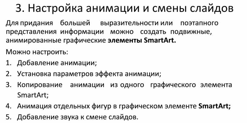 4. Анимация отдельных фигур в графическом элементе SmartArt;