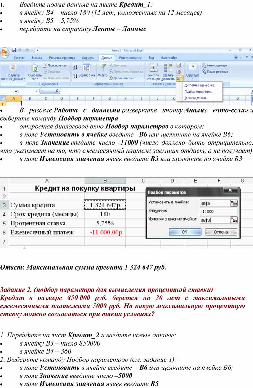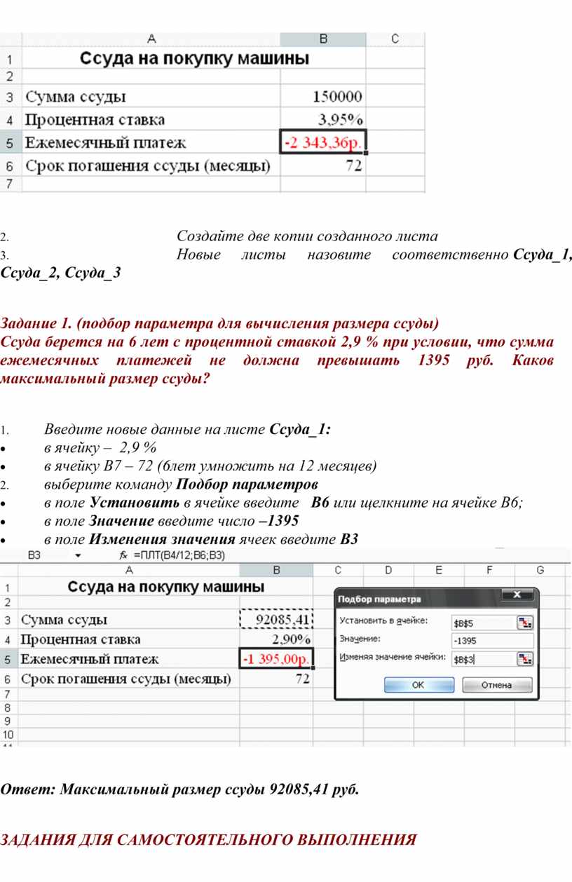 1. Введите новые данные на листе Ссуда_2 и выполните подбор параметров самостоятельно: