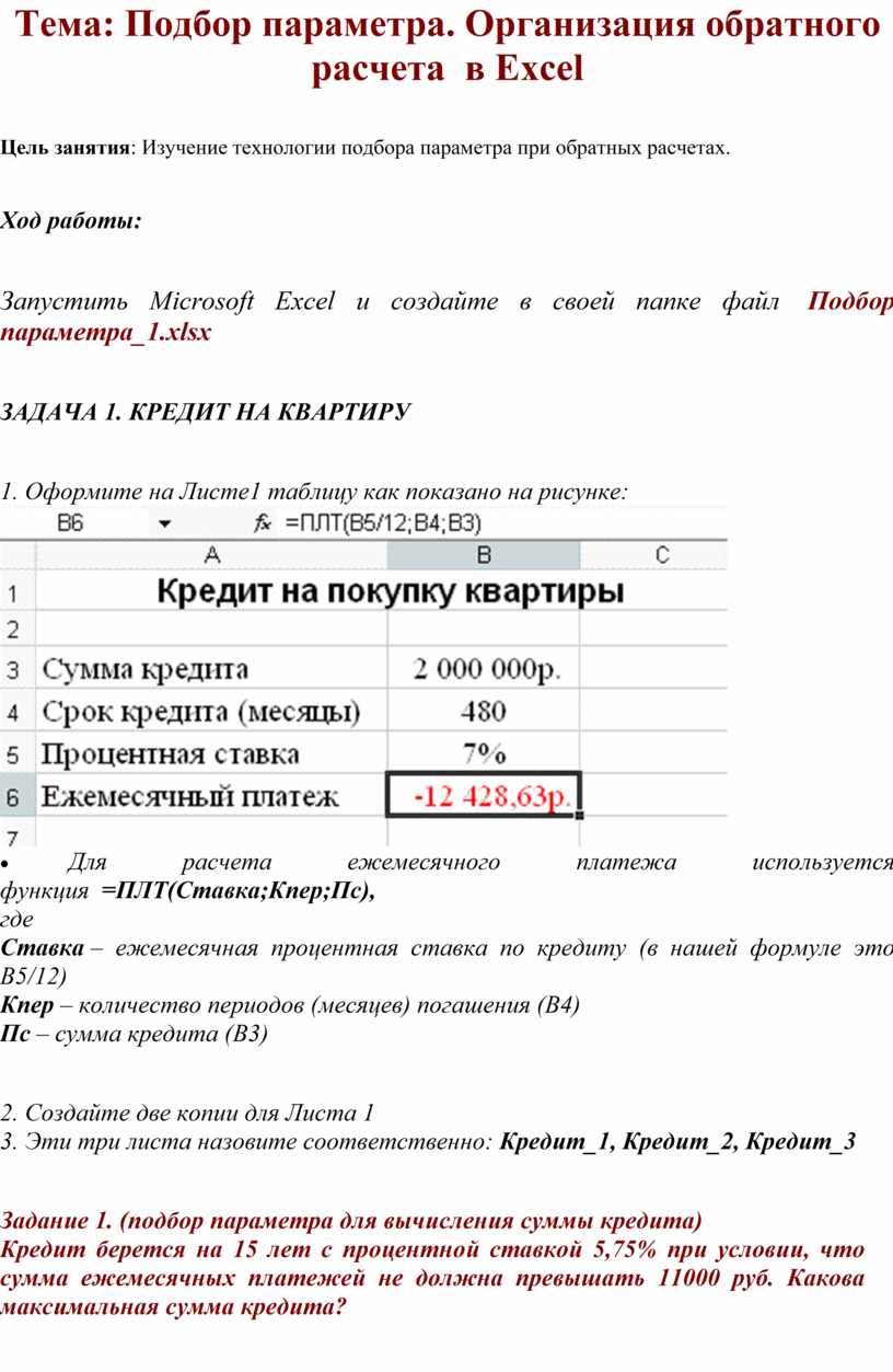 Тема: Подбор параметра. Организация обратного расчета в Excel