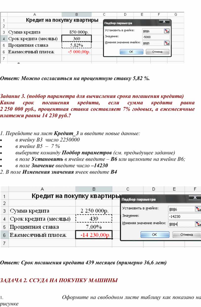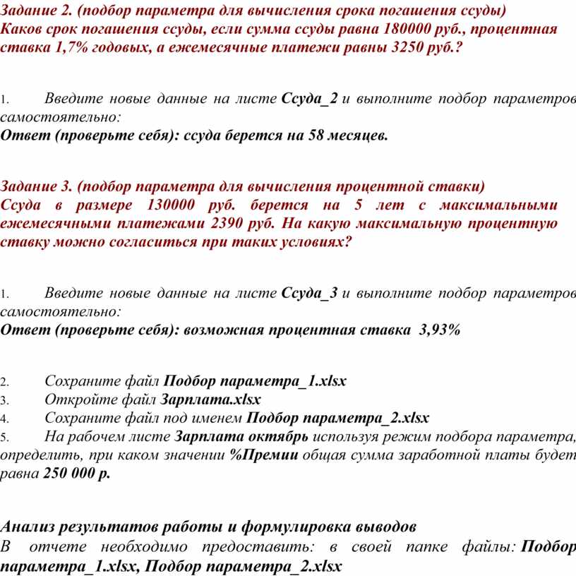 1. Введите новые данные на листе Ссуда_3 и выполните подбор параметров самостоятельно: