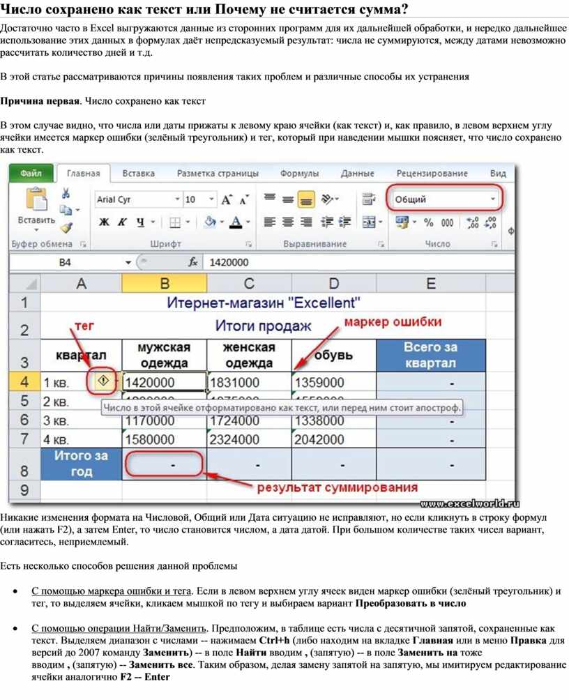 В этом случае видно, что числа или даты прижаты к левому краю ячейки (как текст) и, как правило, в левом верхнем углу ячейки имеется маркер ошибки (зелёный треугольник) и тег, который при наведении мышки поясняет, что число сохранено как текст.