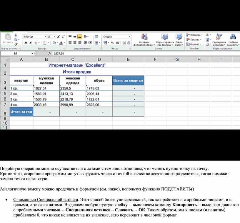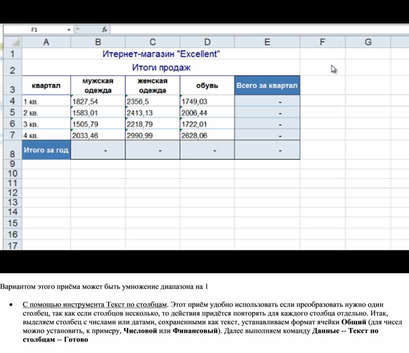 Иногда, чтобы добиться желаемого результата, приходится комбинировать перечисленные способы. Например, сначала удалять пробелы, а затем преобразовывать формат ячеек |