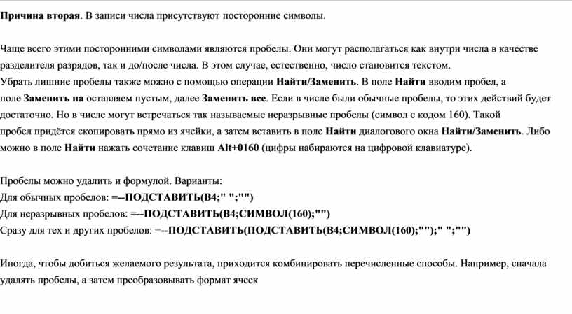 Чаще всего этими посторонними символами являются пробелы. Они могут располагаться как внутри числа в качестве разделителя разрядов, так и до/после числа. В этом случае, естественно, число становится текстом. Убрать лишние пробелы также можно с помощью операции Найти/Заменить. В поле Найти вводим пробел, а поле Заменить на оставляем пустым, далее Заменить все. Если в числе были обычные пробелы, то этих действий будет достаточно. Но в числе могут встречаться так называемые неразрывные пробелы (символ с кодом 160). Такой пробел придётся скопировать прямо из ячейки, а затем вставить в поле Найти диалогового окна Найти/Заменить. Либо можно в поле Найти нажать сочетание клавиш Alt+0160 (цифры набираются на цифровой клавиатуре).