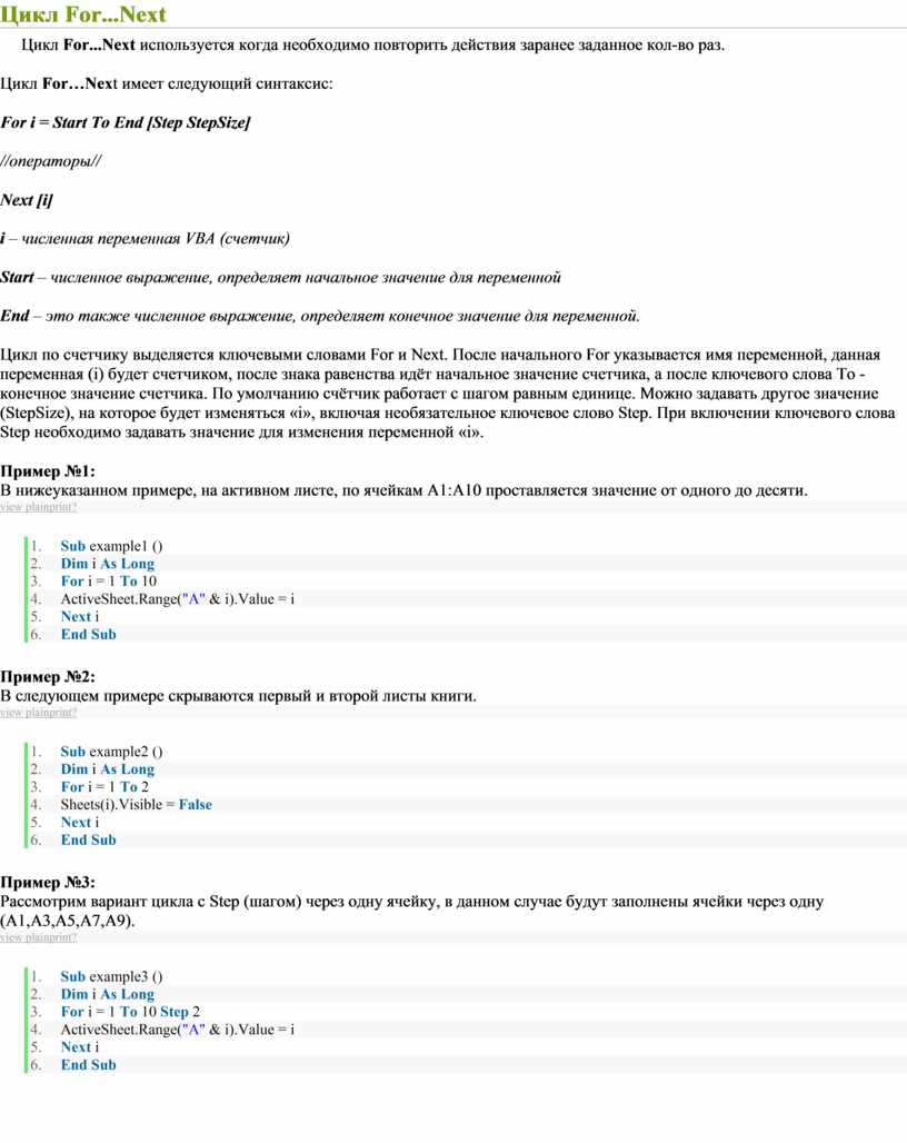 Цикл For…Next имеет следующий синтаксис: