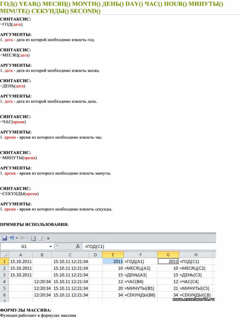 ГОД() YEAR() МЕСЯЦ() MONTH() ДЕНЬ() DAY() ЧАС() HOUR() МИНУТЫ() MINUTE() СЕКУНДЫ() SECOND()