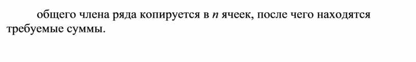 Число S называется суммой ряда. Если конечного предела последовательности частичных сумм не существует, то ряд называется расходящимся. В математике существуют специальные приемы нахождения частичных сумм ряда. В MS Excel обычно вначале вычисляются п первых членов соответствующей числовой последовательности. Для этого вводится требуемое количество значений натурального аргумента, затем формула общего члена ряда копируется в п ячеек, после чего находятся требуемые суммы. |