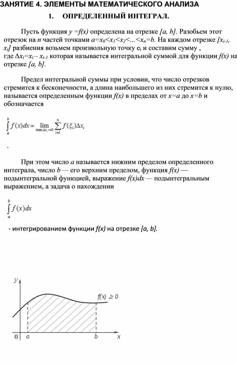 1. ОПРЕДЕЛЕННЫЙ ИНТЕГРАЛ. Пусть функция у =f(x) определена на отрезке [а, b]. Разобьем этот отрезок на п частей точками a=x0<x1<x2<...<xn=b. На каждом отрезке [хi-1, хi] разбиения возьмем произвольную точку ei и составим сумму , где ∆xi=xi – xi-1 которая называется интегральной суммой для функции f(x) на отрезке [а, b]. Предел интегральной суммы при условии, что число отрезков стремится к бесконечности, а длина наибольшего из них стремится к нулю, называется определенным функции f(x) в пределах от x=a до x=b и обозначается . При этом число а называется нижним пределом определенного интеграла, число b — его верхним пределом, функция f(x) — подынтегральной функцией, выражение f(x)dx — подынтегральным выражением, а задача о нахождении - интегрированием функции f(x) на отрезке [а, b].