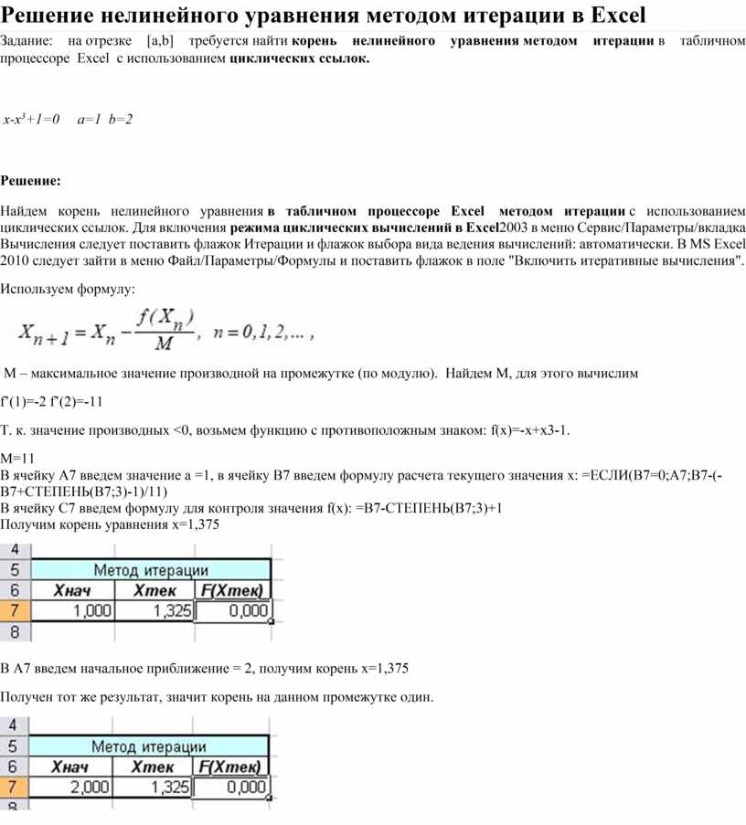 Задание: на отрезке [a,b] требуется найти корень нелинейного уравнения методом итерации в табличном процессоре Excel с использованием циклических ссылок.