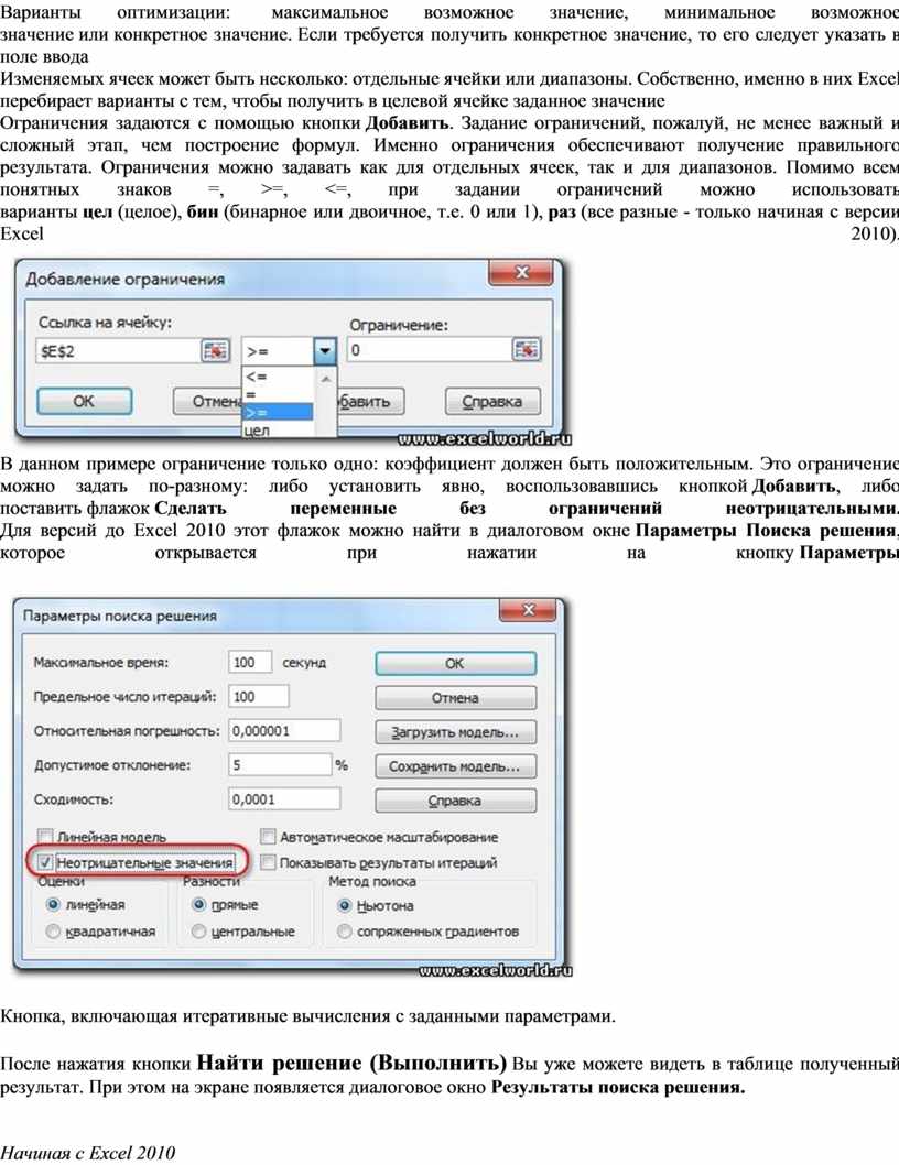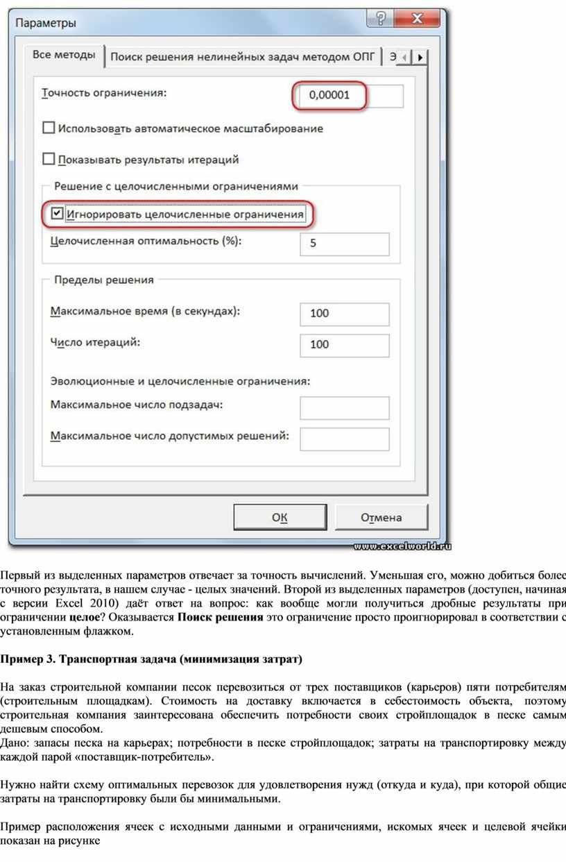 Первый из выделенных параметров отвечает за точность вычислений. Уменьшая его, можно добиться более точного результата, в нашем случае - целых значений. Второй из выделенных параметров (доступен, начиная с версии Excel 2010) даёт ответ на вопрос: как вообще могли получиться дробные результаты при ограничении целое? Оказывается Поиск решения это ограничение просто проигнорировал в соответствии с установленным флажком.