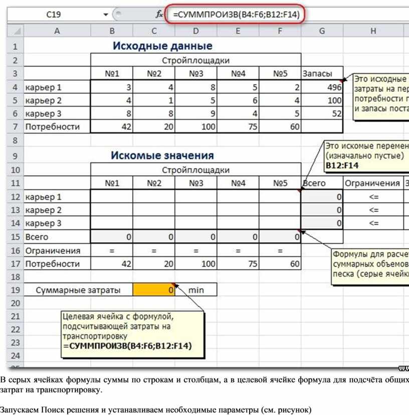 В серых ячейках формулы суммы по строкам и столбцам, а в целевой ячейке формула для подсчёта общих затрат на транспортировку.