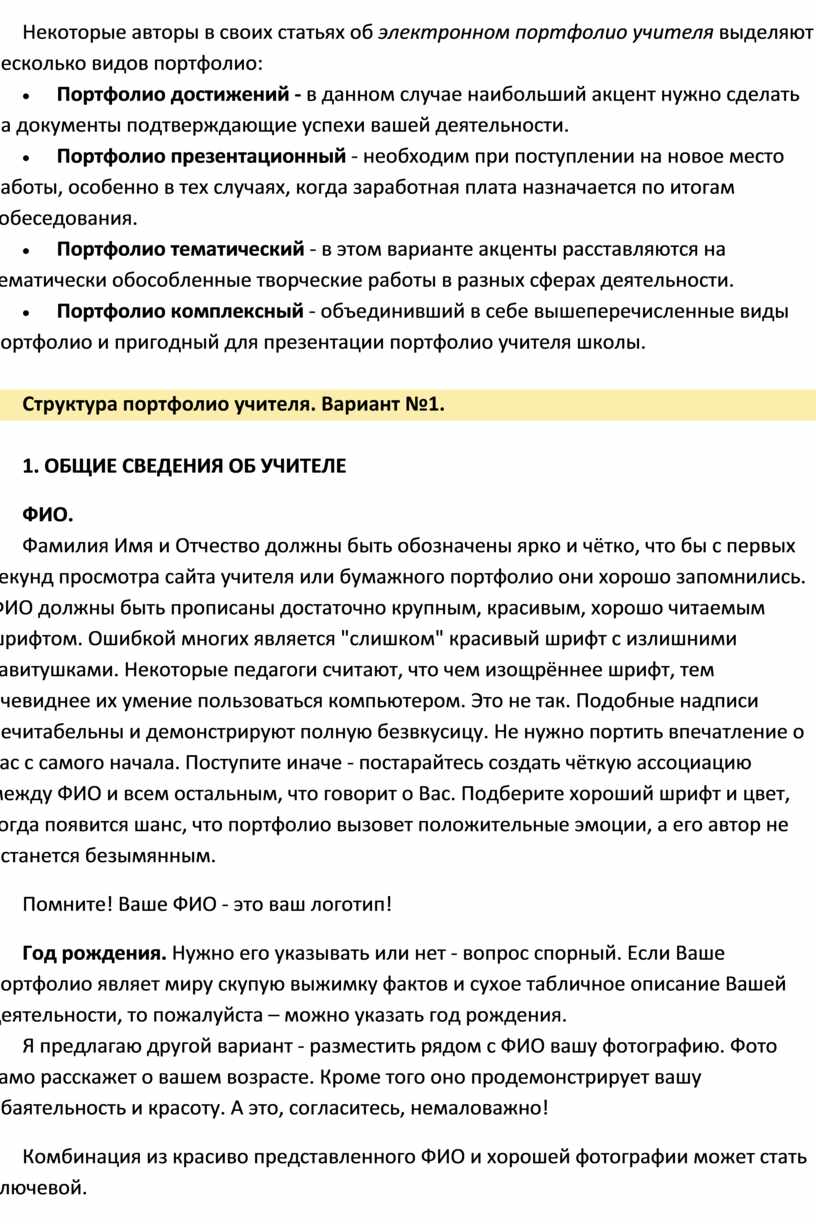 Некоторые авторы в своих статьях об электронном портфолио учителя выделяют несколько видов портфолио:
