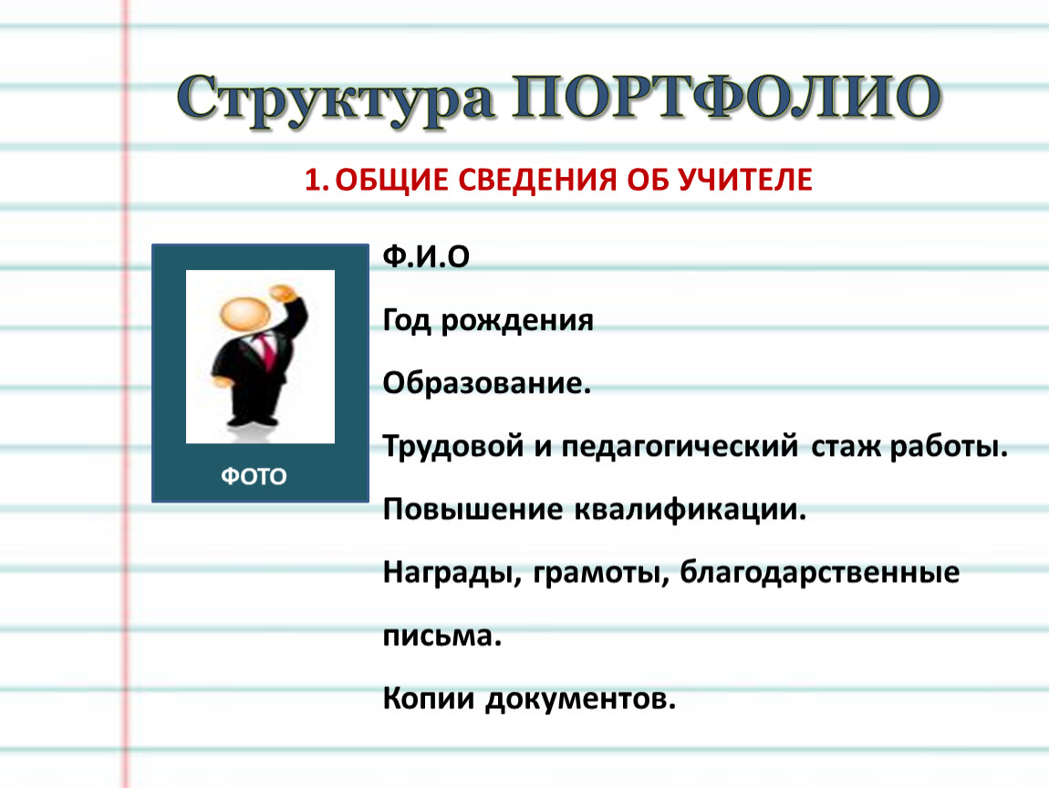 Портфолио учителя - это способ фиксирования, накопления материалов, демонстрирующих уровень профессионализма учителя и умение решать задачи своей профессиональной деятельности. Портфолио учителя показывает уровень подготовленности педагога и уровень активности в учебных и внеучебных видах деятельности.