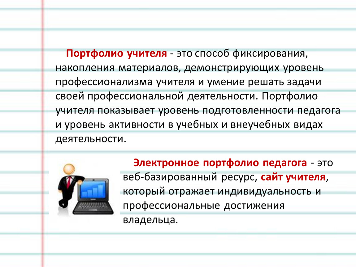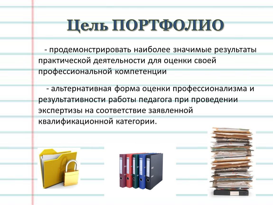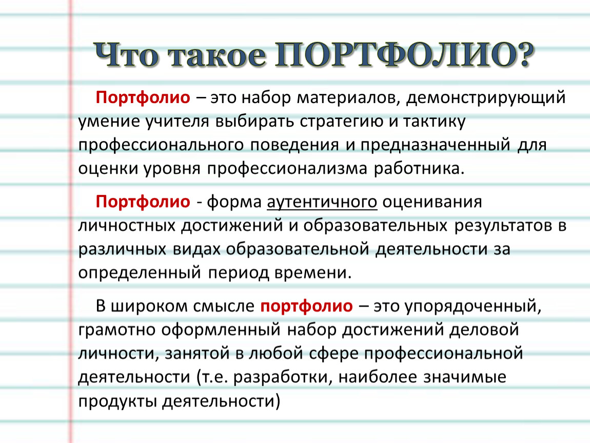 Портфолио – это набор материалов, демонстрирующий умение учителя выбирать стратегию и тактику профессионального поведения и предназначенный для оценки уровня профессионализма работника.