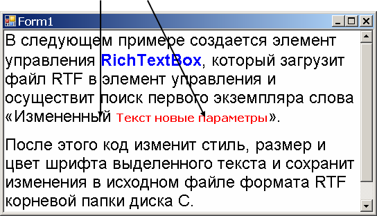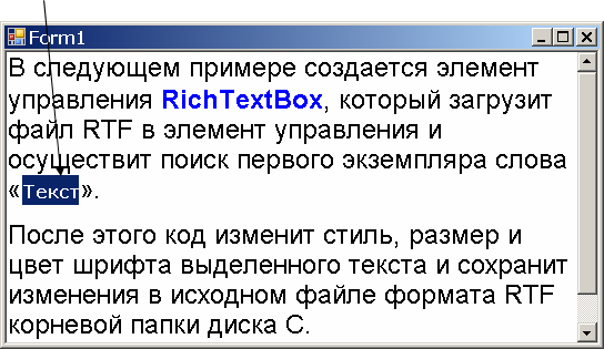 В следующем примере создается элемент управления RichTextBox, который загрузит файл RTF в элемент управления и осуществит поиск первого экземпляра слова «Текст».