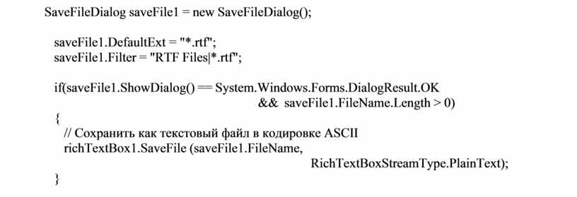 В следующем примере метод SaveFile() используется для указания то- го, что файл должен быть сохранен как текстовый файл в кодировке ASCII, а не в стандартном формате RTF.