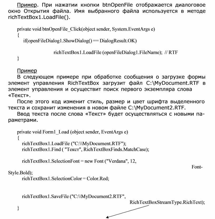 В элементе управления RichTextBox можно отображать содержимое обычного текстового файла, файла текста в формате Юникода или фай- ла формата RTF. Для этого вызывается метод LoadFile().
