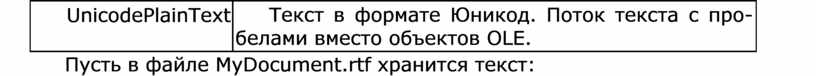 Текст в формате Юникод. Поток текста с про- белами вместо объектов OLE. |